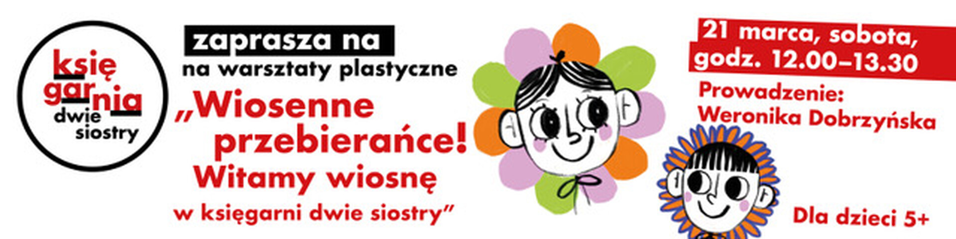 Podczas zajęć zamienimy naszą księgarnię w prawdziwą pracownię kostiumów. Wykorzystując papier, kolorową bibułę, nożyczki oraz nieograniczone pokłady wyobraźni i stworzymy barwne, wiosenne przebrania. Jako barwne kwiaty, radosne ptaki i promienne słońca wyjdziemy na powiślańskie podwórko, by wspólnie przywołać wiosnę i pomóc jej rozgościć się u nas na dobre!