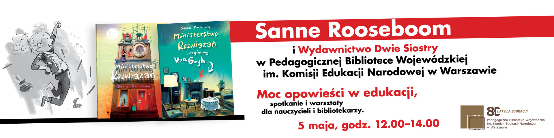 Zapraszamy bibliotekarzy, nauczycieli i edukatorów na wyjątkowe wydarzenie poświęcone literaturze dziecięcej i sztuce opowiadania historii. Już 5 maja wraz z Sanne Rooseboom – niderlandzką autorką bestsellerowej serii Ministerstwo Rozwiązań odwiedzimy Pedagogiczną Bibliotekę Wojewódzką im. Komisji Edukacji Narodowejw Warszawie!