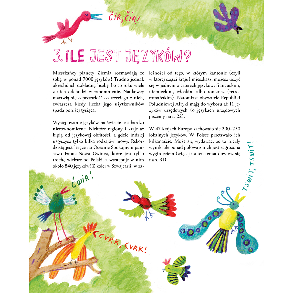Przystępnie i ciekawie przybliża także wiele podstawowych zagadnień związanych z językiem, takich jak różne alfabety, rozwój i zanikanie języków, dwujęzyczność czy kalki językowe i neologizmy. Językowe odmienności ukazuje jako powód do radości i dumy ze wspólnego dziedzictwa, które warto poznawać, doceniać i chronić.