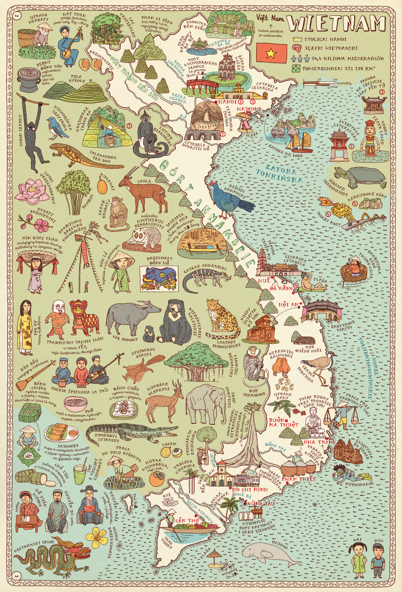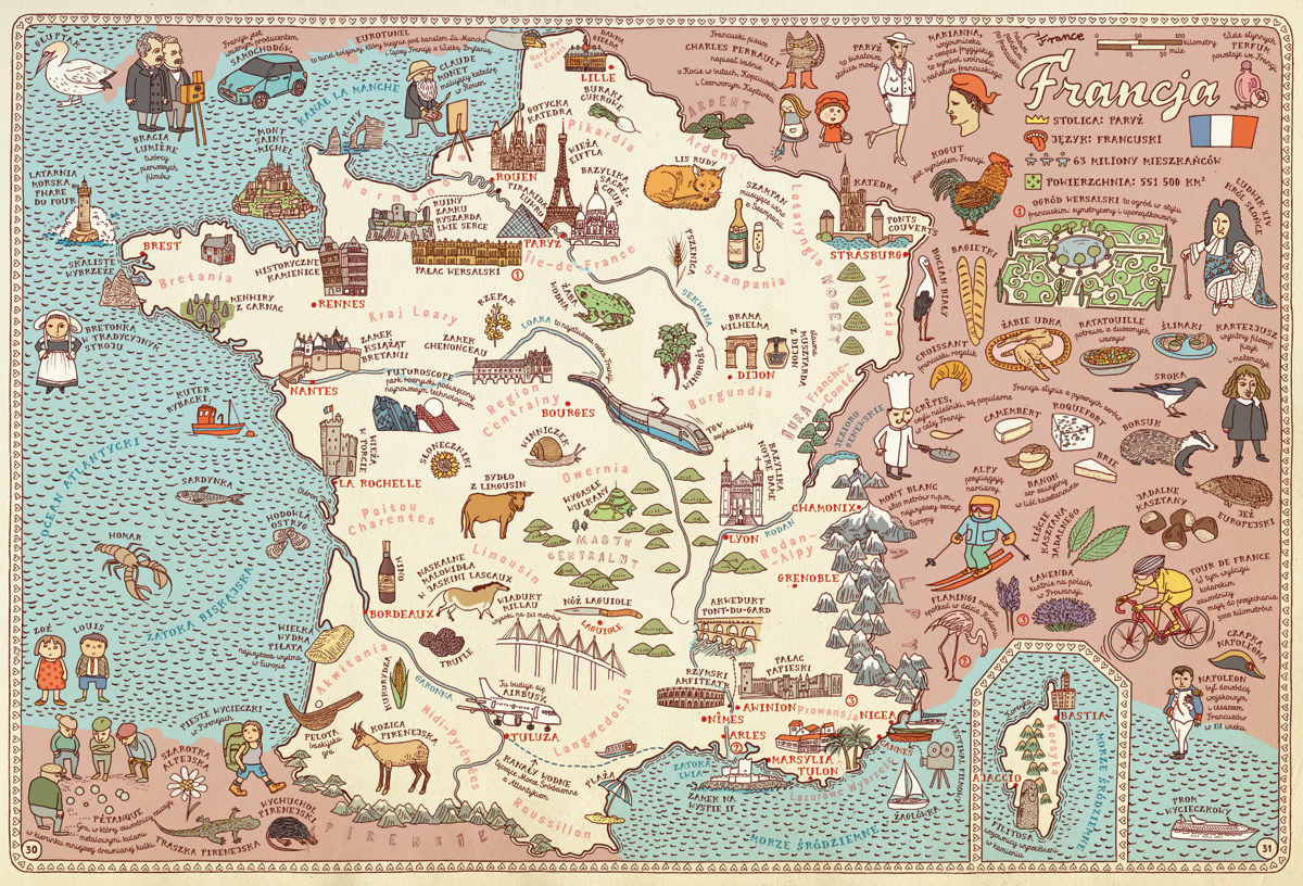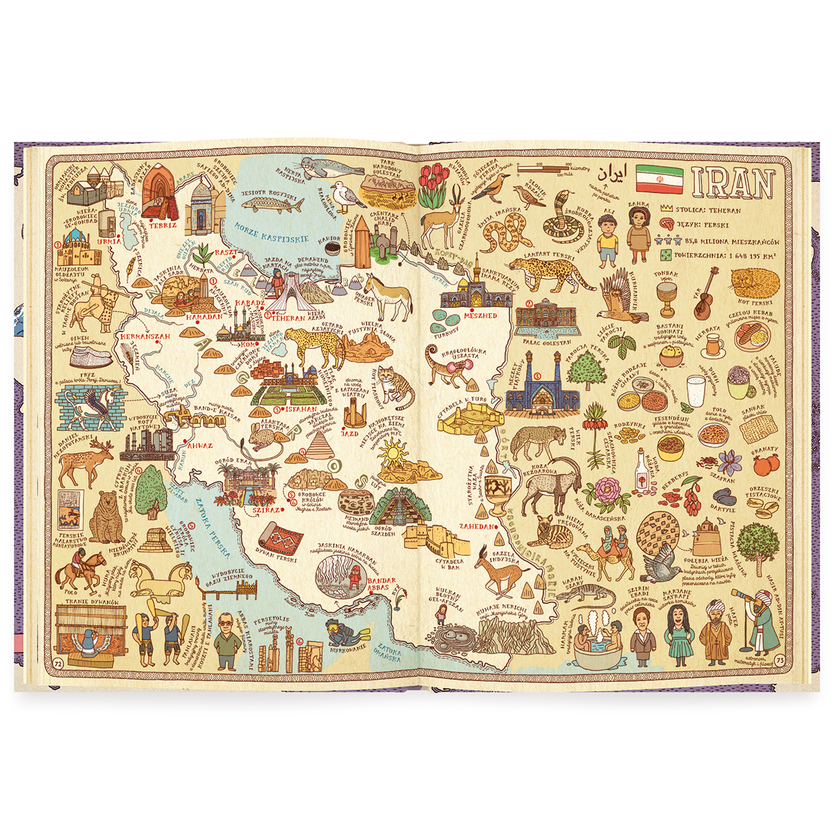 Z tą książką podróże palcem po mapie nabierają nowego wymiaru. Na zawartych w niej rysunkowych mapach państw poza najważniejszymi miastami, rzekami, jeziorami, górami czy nazwami regionów znajdziecie mnóstwo drobnych ilustracji przedstawiających najciekawsze i najbardziej charakterystyczne elementy miejscowej natury i kultury. Są tu rośliny i zwierzęta, parki narodowe i pomniki przyrody, sławni ludzie, zabytki, potrawy, zwyczaje, popularne sporty i aktywności oraz wiele innych informacji. Mapa staje się dzięki temu czymś więcej niż tylko mapą: to bogata obrazkowa opowieść o kraju, zapraszająca do jego odkrywania, poznawania i wypatrywania kolejnych szczegółów i ciekawostek.
