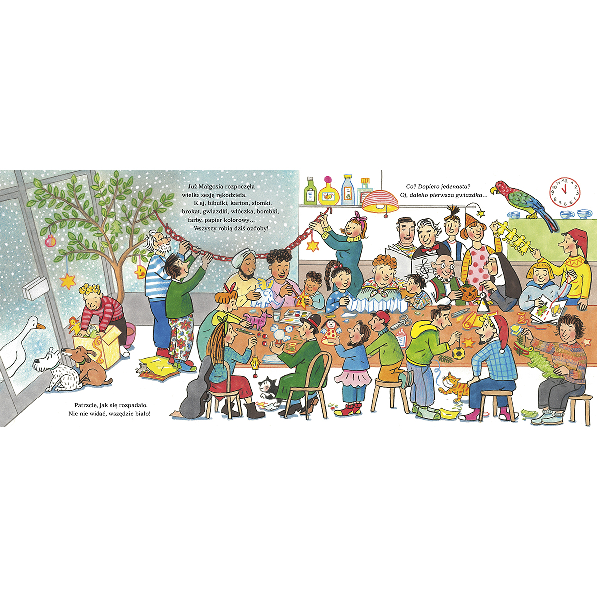 Już Wigilia! Od rana pada śnieg. Ale do wieczoru jeszcze tak daleko… Jak wytrzymać tyle godzin? Mieszkańcy Czereśniowej wpadają na świetny pomysł: spędzą ten czas razem! Będą robić świąteczne ozdoby, jeść barszcz z uszkami i pierniczki, lepić bałwana i śpiewać kolędy. A gdy zapadnie zmierzch – powędrują świątecznym pochodem przez zasypaną śniegiem Czereśniową. Dołącz do nich i poczuj magię świąt!